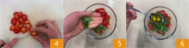 Währenddessen die Kirschtomaten vorbereiten: waschen, trocken tupfen und vierteln 4. In eine Schüssel geben und mit handzerrupftem Basilikum 5 und ein paar Esslöffeln Olivenöl 6 vermengen.