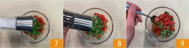 Ein Prise Salz hinzufügen 7 und frisch gemahlenen Pfeffer 8. Gut vermischen und ein paar Minuten ziehen lassen, damit sich die Aromen entfalten.