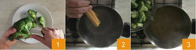 Um die Bucatini Cacio e Pepe mit Broccoli zuzubereiten, bringen Sie Wasser in einem großen Topf zum Kochen: Es wird sowohl für die Bucatini als auch für die Broccoli benötigt. Brechen Sie die Röschen vom Brokkoli ab 1 und waschen Sie sie dann. Kochen Sie die Bucatini 2 und fügen Sie nach 3-4 Minuten auch die Broccoli-Röschen hinzu 3.