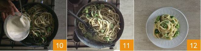 Fügen Sie die Pecorino-Creme hinzu 10, schalten Sie die Hitze aus und mischen Sie die Sauce gut 11. Ihre Bucatini Cacio e Pepe mit Broccoli sind bereit, serviert zu werden 12.