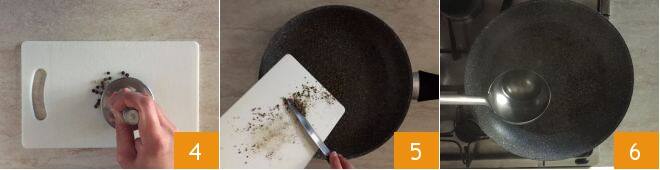 Während sie kochen, zerdrücken Sie ein paar Pfefferkörner 4 und geben Sie sie dann in eine bereits heiße antihaftbeschichtete Pfanne 5. Lassen Sie sie einige Augenblicke rösten, indem Sie die Pfanne gelegentlich schwenken, und löschen Sie dann mit etwas Kochwasser ab 6.
