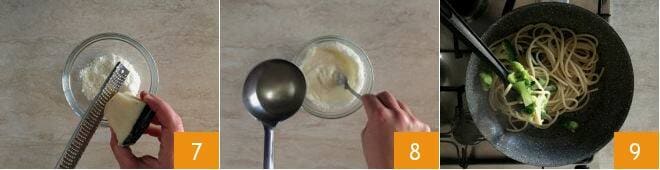 Reiben Sie den Pecorino 7 und rühren Sie ihn nach und nach mit Kochwasser glatt, während Sie mit einer Gabel rühren, um eine cremige Mischung zu erstellen 8. Bevor Sie es in die Pfanne geben, können Sie es mit etwas Dampf aus dem Topf, in dem Sie die Pasta gekocht haben, erwärmen, um keinen Temperaturschock zu erzeugen. Sobald die Bucatini und Broccoli al dente sind, geben Sie sie in die Pfanne mit dem Pfeffer 9 und setzen Sie das Kochen fort, indem Sie bei Bedarf etwas Kochwasser der Pasta hinzufügen.
