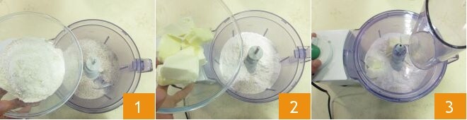 Um die Buchweizenkekse zuzubereiten, gebt das Buchweizenmehl und das 00-Mehl in den Mixer 1, fügt dann die kalte Butter hinzu 2 und lasst die Klingen einige Momente laufen, bis die Mischung sandig ist 3.