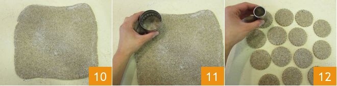 Bestäubt die Fläche mit einer Prise Mehl und rollt den Teig mit Hilfe eines Nudelholzes aus, bis ihr ein Rechteck von 3 Millimetern Dicke erhaltet 10. Stecht dann mit einem gewellten Ausstecher von 6,5 cm Durchmesser 22 Kekse aus 11. Mit einem kleineren Ausstecher, 3 cm, stecht ihr 11 Kekse aus 12.