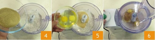 Fügt dann den braunen Zucker 4 und die Eier 5 hinzu und lasst die Klingen wieder laufen 6.