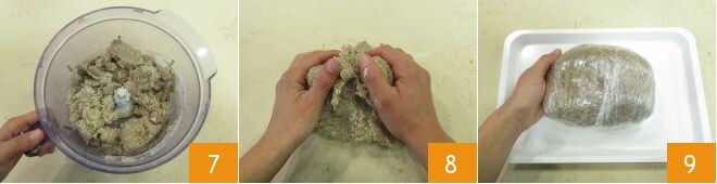 bis die Mischung verbunden ist 7. Übertragt sie auf die Arbeitsfläche und knetet sie einige Momente, um den Teig zu glätten 8. Wickelt den Teigklumpen in Frischhaltefolie und lasst ihn dann mindestens 20 Minuten im Kühlschrank ruhen 9.