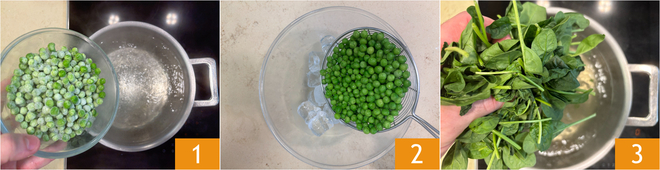 Um die Buchweizennudeln mit Erbsencreme und knusprigem Speck zuzubereiten, blanchieren Sie als erstes die Erbsen für 5 Minuten in kochendem Salzwasser 1. Gießen Sie sie ab und geben Sie sie in Eiswasser 2. Blanchieren Sie im selben Wasser auch den Spinat für 5 Minuten 3.