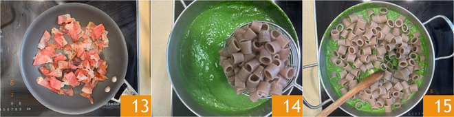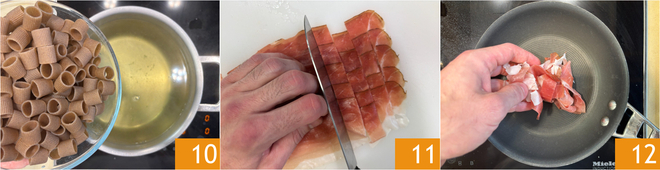 Kochen Sie die Buchweizennudeln im selben Wasser, in dem Sie das Gemüse blanchiert haben 10. Schneiden Sie inzwischen den Speck grob 11 und rösten Sie ihn kurz in einer Pfanne 12.