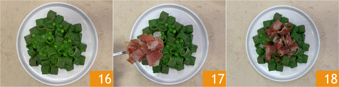 Richten Sie an und vervollständigen Sie mit den beiseitegelegten Erbsen 16 und dem Speck 17. Ihre Buchweizennudeln mit Erbsencreme und knusprigem Speck sind servierfertig 18!