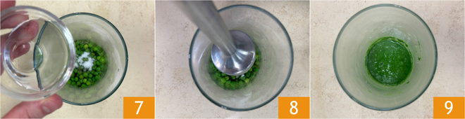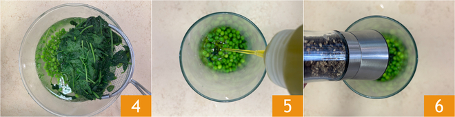 Gießen Sie ab und geben Sie auch den Spinat in Eiswasser 4. Gießen Sie das Gemüse ab und geben Sie es in einen Behälter, wobei Sie etwa 50 g Erbsen für das Anrichten beiseitelegen. Würzen Sie mit Öl 5, Salz und Pfeffer 6.