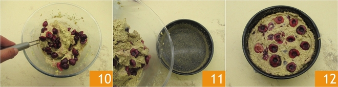 Nun die Kirschen mit einem Spatel hinzufügen und mit kreisenden Bewegungen vermengen 11. Eine Springform von 18 cm einfetten und zuckern. Den Teig in die Form gießen 11 und mit einem Spatel oder dem Rücken eines Löffels gleichmäßig verteilen 12.