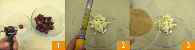Um die Buchweizentorte mit Aprikosen und Kirschen zuzubereiten, entsteine die Kirschen 1 und halbiere sie. Gib die plastische Butter mit Zitronenschale 2, eine Prise Salz und 150 g Rohrzucker in eine Schüssel 3.