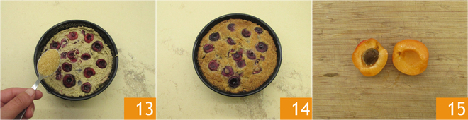 Die Oberfläche leicht mit genug Rohrzucker bestäuben 13. Im vorgeheizten statischen Ofen bei 160° etwa 55-60 Minuten backen, mit einem Holzstäbchen prüfen, ob der Kuchen durchgebacken ist 14. Die Aprikosen halbieren und den Stein entfernen 15.