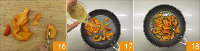 Dann in kleine Spalten schneiden 16. In einer Pfanne mit 50 g Rohrzucker bei hoher Hitze anbraten 17: Sobald sie gleichmäßig mit Karamell überzogen sind, vom Feuer nehmen 18, bevor sie zu viel Sirup verlieren und an Konsistenz verlieren. Dies dauert 2-3 Minuten.