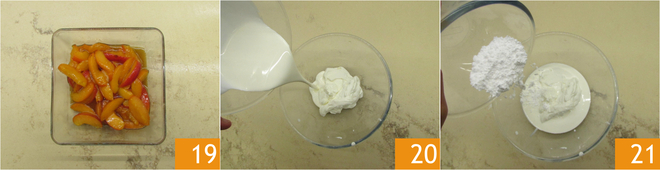 Die gesüßten Aprikosen beiseitestellen 19. In einer Schüssel die Sahne, den griechischen Joghurt 20 und den Puderzucker 21 geben.