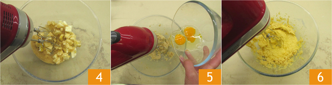 Schlage mit dem Schneebesen auf 4. Wenn die Masse cremig ist, füge die Eier nacheinander hinzu 5 und schlage nach dem vollständigen Einfüllen 3-4 Minuten lang 6.