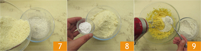 In einer Schüssel das Buchweizenmehl, das Mandelmehl 7 und das gesiebte Backpulver 8 mischen. Mit dem Schneebesen die trockenen Zutaten gut einarbeiten, einen Löffel nach dem anderen 9.