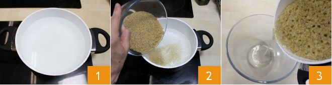 Um den Bulgur mit frischem Kräuterpesto und Nüssen zuzubereiten, beginnen Sie mit der Zubereitung des Bulgur: Waschen Sie den Bulgur unter fließendem Wasser, bringen Sie 600 ml Wasser zum Kochen 1, salzen Sie es und geben Sie den Bulgur hinzu 2; kochen Sie ihn etwa 15-20 Minuten (oder gemäß den Angaben auf der Verpackung), dann gießen Sie ihn ab, geben Sie ihn in eine Schüssel 3