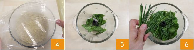 und decken Sie ihn mit Frischhaltefolie ab 4, lassen Sie ihn beiseite, bis er abgekühlt ist. Der Bulgur wird sein Volumen verdoppelt haben. Widmen Sie sich nun dem Pesto: Nehmen Sie einen Mixer (wenn Sie möchten, können Sie auch einen Mörser verwenden) und geben Sie die zuvor gewaschenen und getrockneten aromatischen Kräuter hinein: das Basilikum 5, die Schnittlauchstiele 6,
