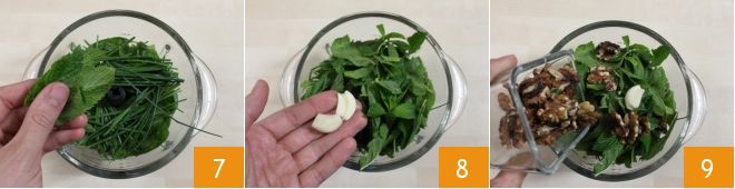 die Minzblätter 7, die Knoblauchzehe 8 (die Sie auch weglassen können, wenn Sie sie nicht mögen), die geschälten Nüsse 9