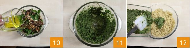und fügen Sie einen Schuss Öl hinzu 10, schalten Sie den Mixer ein und fügen Sie nach und nach so viel natives Olivenöl extra hinzu, wie nötig, um eine fast cremige Masse zu erhalten 11. Würzen Sie mit Salz und geben Sie das Pesto in die Schüssel mit dem Bulgur, damit der Bulgur den Geschmack des Kräuterpestos annimmt 12.