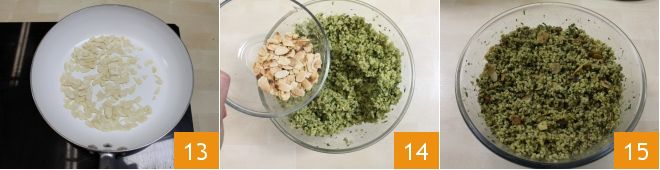 Rösten Sie nun die Mandeln einige Minuten in einer heißen Pfanne ohne Öl 13, indem Sie sie mehrmals wenden, um ein Anbrennen zu vermeiden. Geben Sie die gerösteten Mandeln zum Bulgur und mischen Sie, um eine homogene Masse zu erhalten. Ihr Bulgur mit frischem Kräuterpesto und Nüssen ist bereit zum Genießen!