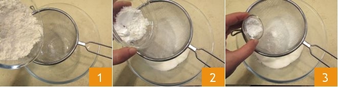 Um den Bundt-Kuchen zuzubereiten, sieben Sie zuerst das Mehl in eine Schüssel 1, fügen Sie dann die Maisstärke 2 und das Backpulver hinzu, immer durch ein Sieb 3, fügen Sie eine Prise Salz hinzu, mischen Sie alles und stellen Sie die trockenen Zutaten beiseite.