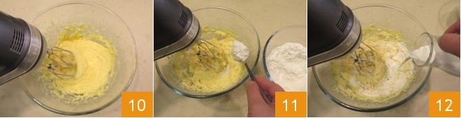 und arbeiten Sie weiter, bis sie vollständig eingearbeitet sind 10. Zu diesem Zeitpunkt können Sie nach und nach die trockenen Zutaten mit einem Löffel 11 und die Milch bei Raumtemperatur langsam hinzufügen 12, indem Sie sie abwechseln und den Mixer ständig in Betrieb halten.