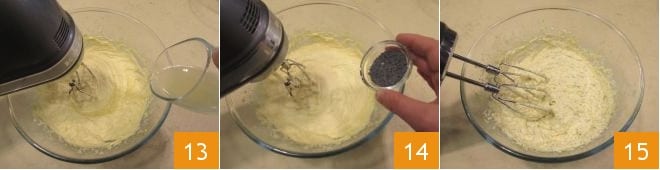 Fügen Sie schließlich die 45 g gefilterten Zitronensaft 13 und die Mohnsamen 14 hinzu und verarbeiten Sie die Mischung, bis alle Zutaten gut vermischt sind: Ihr Teig ist bereit 15.