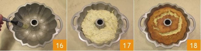 Nun die spezifische Bundt-Kuchenform, etwa 20 cm im Durchmesser und 9 cm in der Höhe, mit Butter einfetten 16 und mit Mehl bestäuben. Füllen Sie die Form mit dem Teig 17 und backen Sie ihn im bereits auf 170° vorgeheizten statischen Ofen für ca. 60 Minuten; sollte der Kuchen während des Backens zu dunkel werden, decken Sie ihn mit einem Blatt Aluminiumfolie ab. Sobald er fertig gebacken ist (machen Sie immer den Stäbchentest, um den Gargrad zu überprüfen), nehmen Sie den Bundt-Kuchen aus dem Ofen 18 und lassen Sie ihn 10-15 Minuten in der Form abkühlen,