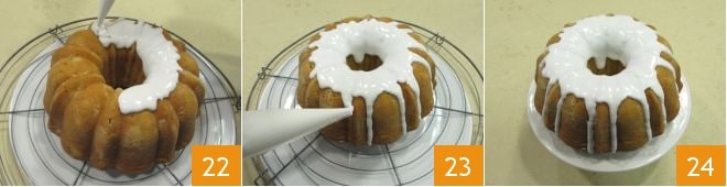 Übertragen Sie die Glasur in einen Spritzbeutel und wenn der Bundt-Kuchen gut abgekühlt ist, legen Sie ein Tablett unter das Gitter (dies wird dazu dienen, die Glasur aufzufangen, die abtropfen wird, bevor sie trocknet); dekorieren Sie den Kuchen, indem Sie die Oberseite gleichmäßig bedecken 22 und vertikale Linien in der Nähe der seitlichen Rillen zeichnen, beginnend von oben und mit dem Spritzbeutel nach unten entlang jeder Rille des Kuchens 23 oder erstellen Sie ein dekoratives Muster nach Ihrem Geschmack; alternativ zum Spritzbeutel können Sie einen Teelöffel verwenden. Sobald die Glasur getrocknet ist, ist Ihr duftender Bundt-Kuchen bereit, genossen zu werden 24!