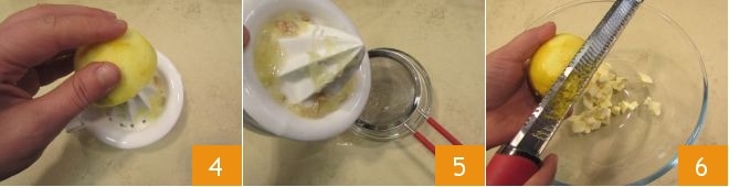 Pressen Sie den Zitronensaft aus 4 und filtern Sie ihn durch ein Sieb 5 (Sie benötigen 45 g für den Teig und 20 g für die Glasur), heizen Sie dann den Ofen auf 170° im statischen Modus vor. In einer anderen großen Schüssel das weiche Butter in Stücke hinzufügen und die Schale von 2 Zitronen direkt in die Schüssel reiben, wobei darauf zu achten ist, nur den gelben Teil der Schale zu verwenden 6.