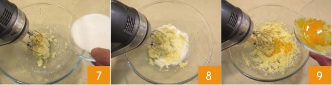 Verarbeiten Sie die Butter mit einem elektrischen Mixer auf mittlerer bis niedriger Geschwindigkeit, bis sie cremig wird; sobald diese Konsistenz erreicht ist, fügen Sie nach und nach den Zucker hinzu 7, schlagen Sie weiter mit dem Mixer für etwa 3-4 Minuten, immer auf mittlerer bis niedriger Geschwindigkeit 8. Dann fügen Sie die Eier bei Raumtemperatur nacheinander hinzu 9,
