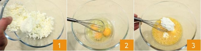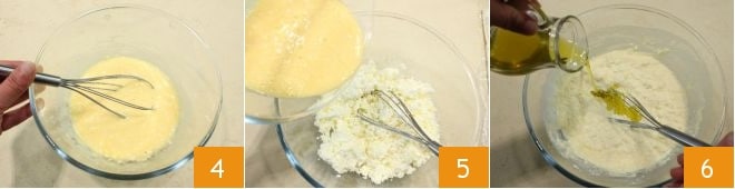 und rühren Sie mit dem Schneebesen um, um ihn zu integrieren 4, geben Sie die Mischung aus geschlagenen Eiern zur Skuta 5, rühren Sie die Mischung, zuletzt fügen Sie das Olivenöl in dünnem Strahl 6 hinzu, während Sie weiter rühren.