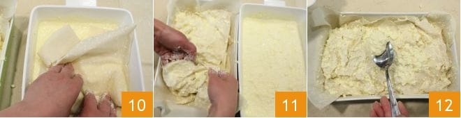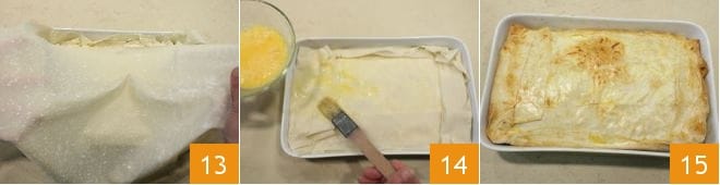 Nehmen Sie ein weiteres Blatt Filoteig, falten Sie es und tauchen Sie es in die Schüssel mit der Ei-Käse-Mischung, um es zu aromatisieren 10, und legen Sie es dann in die Form 11. Fahren Sie auf diese Weise fort, indem Sie die Pastenblätter in die Füllung tauchen, bis die Zutaten aufgebraucht sind, und achten Sie darauf, mit einer Schicht nur Füllung zu enden, die mit einem Löffel auf der Oberfläche verteilt wird 12.