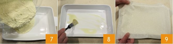 Geben Sie die erhaltene Mischung in eine breite Schüssel 7, dann ölen Sie eine rechteckige Form von etwa 30x20 cm 8 ein, legen Sie den Boden mit einem Blatt Filoteig aus, lassen Sie den Teig über den Rand hängen, da er benötigt wird, um das Gebäck zu verschließen 9.