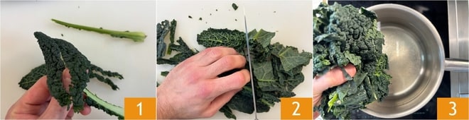 Um die Grünkohl- und Kichererbsen-Burger zuzubereiten, reinigen Sie zuerst den Grünkohl, indem Sie die Stiele von den Blättern trennen 1, dann schneiden Sie diese grob 2. Geben Sie den Grünkohl in einen Topf mit kochendem Salzwasser 3.