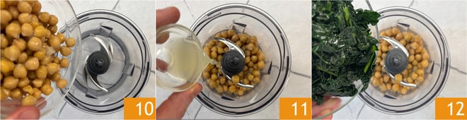 In einer Küchenmaschine geben Sie die abgetropften Kichererbsen 10 und den Zitronensaft 11, dann fügen Sie den Grünkohl hinzu 12.