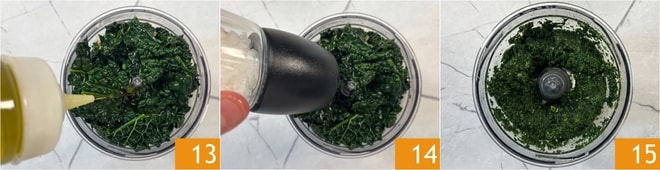 Fügen Sie das Öl 13 und das Salz 14 hinzu und pürieren Sie alles, um eine einigermaßen grobe Konsistenz zu erhalten, nicht perfekt glatt 15.