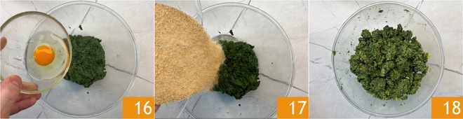 Übertragen Sie die Mischung in eine Schüssel, dann fügen Sie das Ei hinzu 16 und das Paniermehl nach und nach 17. Mischen Sie mit einer Gabel, um alles gut zu verbinden, und passen Sie die Menge des Paniermehls je nach Konsistenz an 18.