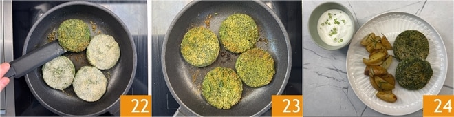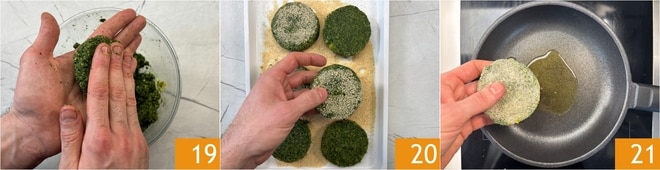 Formen Sie die Burger, indem Sie etwas von der Mischung auf der Handfläche zusammendrücken und flachdrücken 19; um eine präzisere Form zu erhalten, können Sie ein Glas oder einen Dessertring verwenden. Mit diesen Mengen erhalten Sie 6 Burger mit einem Durchmesser von etwa 9 cm. Legen Sie sie nach und nach auf ein mit Backpapier ausgelegtes Tablett, auf das Sie weiteres Paniermehl gestreut haben, und bedecken Sie beide Seiten leicht 20. Sie sind bereit zum Kochen: Legen Sie die Burger in eine Pfanne, in der Sie etwas Öl erhitzt haben 21.