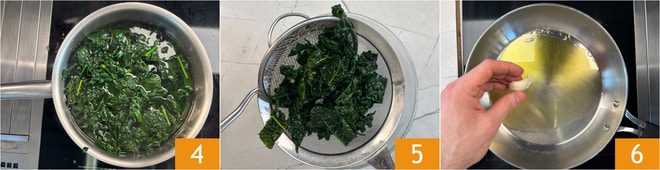 Kochen Sie den Grünkohl etwa zehn Minuten lang 4, dann lassen Sie ihn abtropfen, um das überschüssige Wasser zu entfernen 5. In einer Pfanne braten Sie eine Knoblauchzehe in etwas Öl an 6.