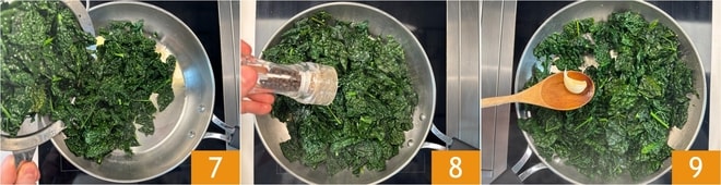 Fügen Sie den gut abgetropften Grünkohl hinzu 7, salzen und pfeffern Sie 8 und braten Sie ihn etwa 10 Minuten bei mittlerer Hitze an. Schalten Sie die Hitze aus, entfernen Sie den Knoblauch 9 und lassen Sie ihn abkühlen.