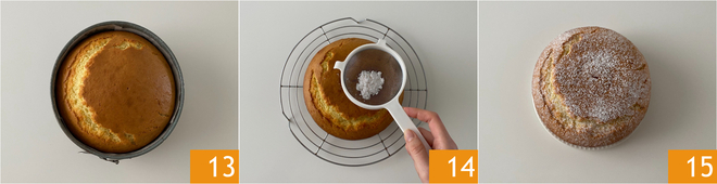 Nehmen Sie den Kuchen aus dem Ofen und lassen Sie ihn abkühlen 13. Nehmen Sie ihn dann aus der Form auf ein Gitter und bestäuben Sie ihn mit etwas Puderzucker 14. Der Joghurtkuchen ohne Butter ist bereit zum Genießen 15.