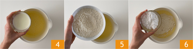 Fügen Sie den weißen Joghurt 4, das Mehl 5 und das Maisstärke 6 hinzu.