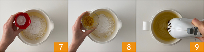 Fahren Sie fort, indem Sie auch das Backpulver 7 und die abgeriebene Zitronenschale 8 hinzufügen. Arbeiten Sie alle Zutaten weiterhin mit den Rührbesen, um eine glatte und homogene Masse ohne Klumpen zu erhalten 9.