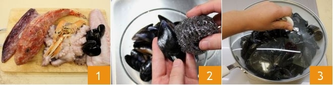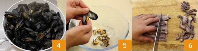und lassen Sie sie 5 Minuten lang auf hoher Flamme, bis sie sich öffnen 4. An diesem Punkt können Sie die Schalentiere schälen 5, ein paar ganze Muscheln beiseite legen. Machen Sie mit dem Tintenfisch weiter. Reinigen Sie ihn gemäß Anleitung und schneiden Sie dann die Tentakel grob 6.