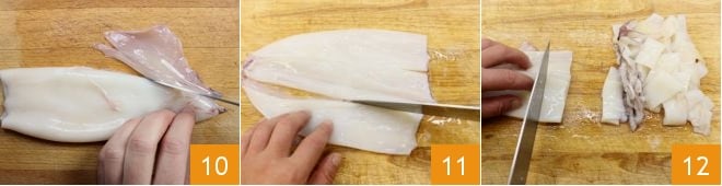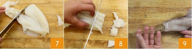 Um die Sepien zu reinigen, müssen Sie den Kopf und die Tentakel vorsichtig vom Mantel trennen, sie gut waschen und das Knorpelstift und den Tintenbeutel entfernen. Hacken Sie die Tentakel 7 und die Köpfe 8 klein. Fahren Sie mit den Kalmaren fort. Sobald der Kopf herausgezogen ist, suchen Sie den durchsichtigen Knorpelstift im Mantel und ziehen Sie ihn vorsichtig heraus 9,
