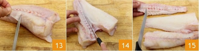 Fahren Sie mit dem Seeteufel fort: Entfernen Sie die äußere Haut 13, teilen Sie das Fleisch entlang der Gräte 14, und filetieren Sie es 15, wobei Sie auch die Abfälle beiseitehalten.