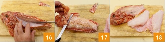 Es ist nun notwendig, den Drachenkopf zu entschuppen, ihm den Schwanz zu entfernen und ihn entlang dem Rücken einzuschneiden 16, dann die Flossen entfernen 17 und ihn filetieren 18, wobei Sie die Abfälle beiseitehalten.